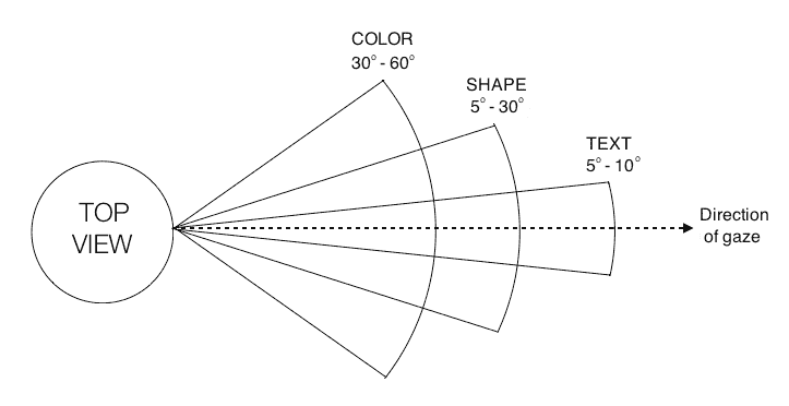 为了了解我们的视野,让我们看看人类的俯视图,以及我们观察各种事物的角度: