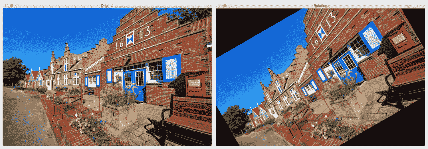 右图是左图的旋转版本。 在 OpenCV 中,我们只需一行即可执行此转换。