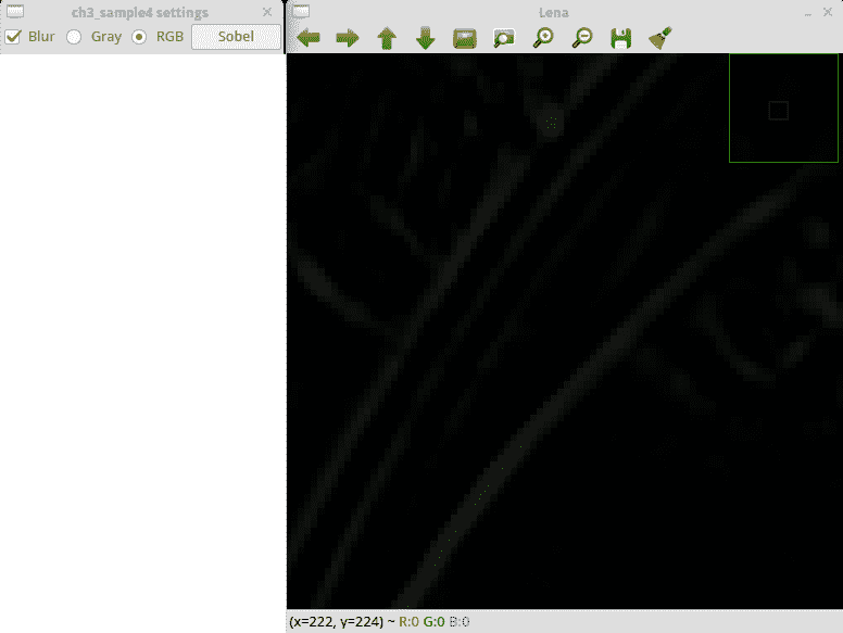 在我们的示例中,我们同时使用x和y导数,覆盖输入。 以下代码片段显示如何同时生成x和y导数,在第四个和第五个参数中添加1: