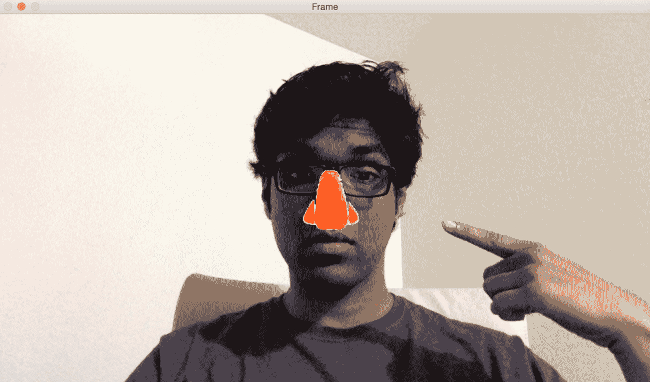 既然您知道了如何使用该框架跟踪不同的东西,那么您也可以尝试跟踪您的鼻子、嘴巴和耳朵了。 让我们用鼻子探测器覆盖一个滑稽的鼻子: