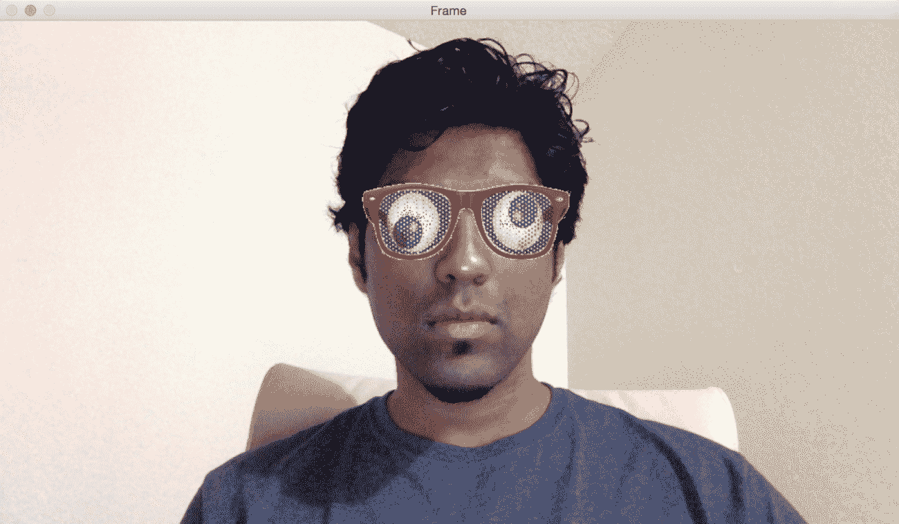 对于每一帧,我们从检测人脸开始。 然后我们继续对这个区域进行手术来检测眼睛的位置。 在这一步之后,我们需要覆盖太阳镜。 要做到这一点,我们需要调整太阳镜图像的大小,以确保它适合我们的脸。 为了获得合适的比例,我们可以考虑被检测的两只眼睛之间的距离。 只有当我们察觉到两只眼睛时,我们才会戴上太阳镜。 这就是为什么我们首先运行眼睛探测器,收集所有的中心,然后覆盖太阳镜。 一旦我们有了这个,我们只需要盖上太阳镜面具。 用于遮罩的原理与我们用于覆盖面膜的原理非常相似。 您可能需要定制太阳镜的大小和位置,具体取决于您想要的。 你可以玩不同类型的太阳镜,看看它们是什么样子。