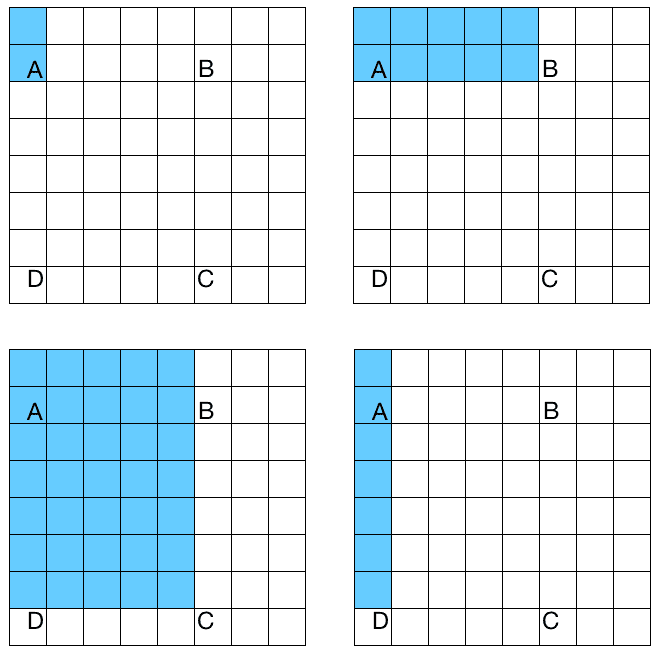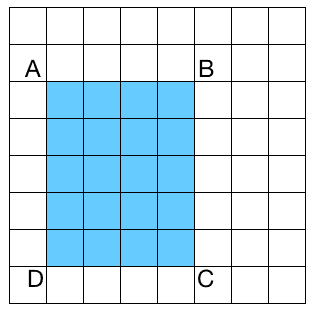 让我们考虑一下上图中的左上角正方形。 蓝色像素表示左上角像素和点A之间的区域。 这由 AA表示。 其余的图表由各自的名称表示:AB、AC和 AD。 现在,如果我们要计算矩形的面积,如上图所示,我们将使用以下公式: