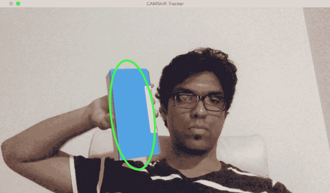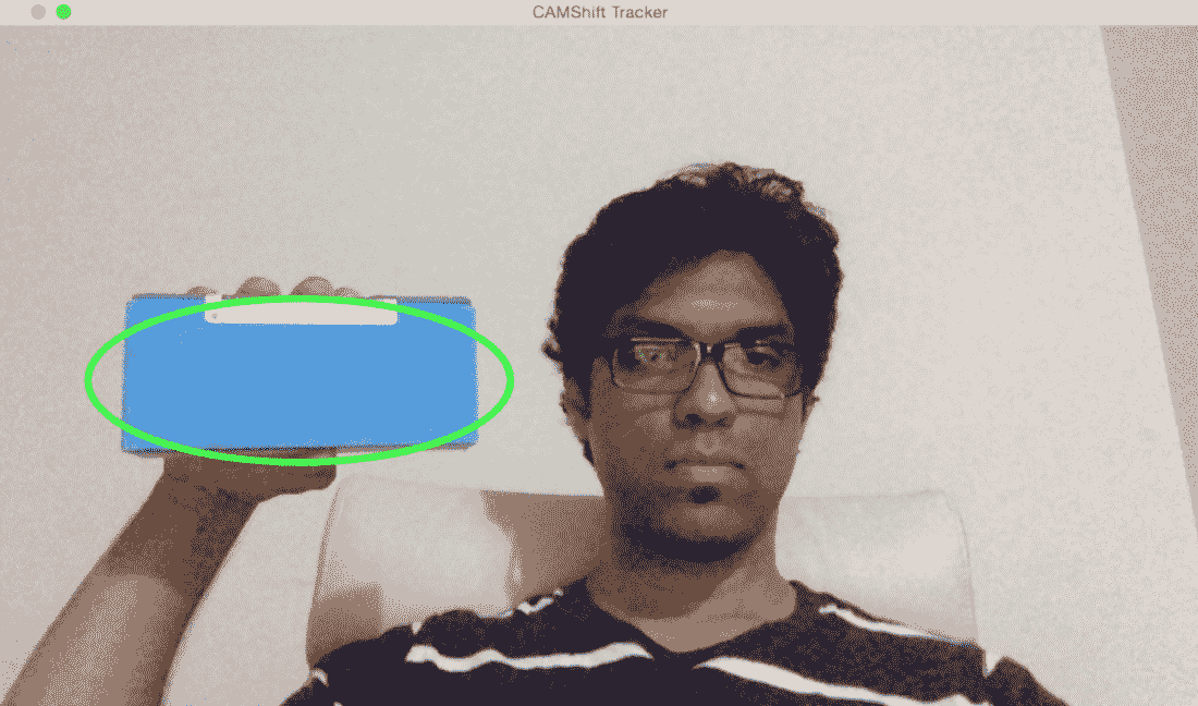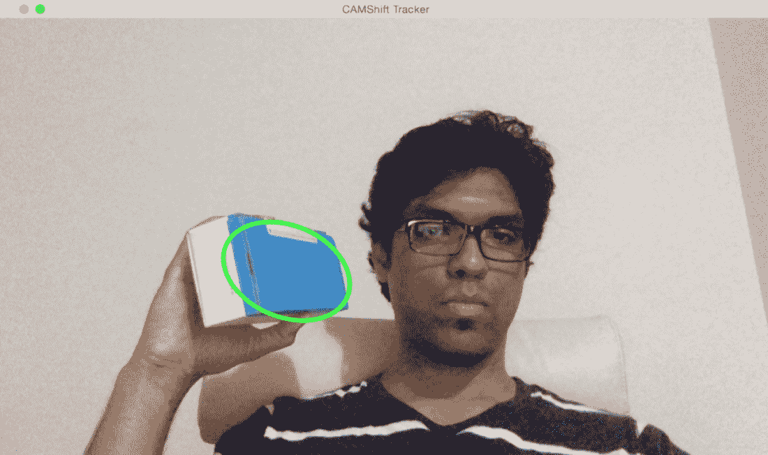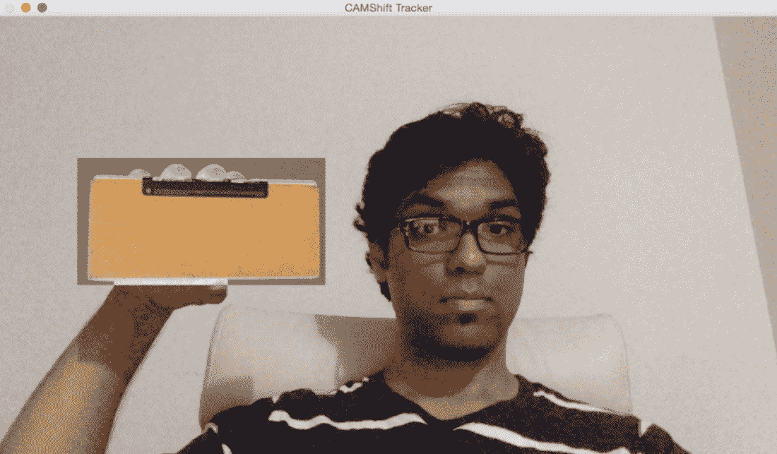 现在我们已经选择了对象,该算法计算直方图反投影并提取所有信息。 什么是直方图反投影? 这只是一种识别图像是否符合我们直方图模型的方法。 我们计算特定物体的直方图模型,然后使用该模型在图像中找到该物体。 让我们移动对象,看看它是如何被跟踪的:
