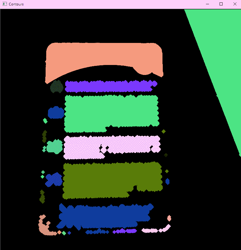 在第一个参数中,我们传递放大的图像。 第二个参数是检测到的轮廓的向量。 然后,我们使用该选项仅检索外部轮廓并使用简单近似。 图像轮廓如下所示。 每种灰色色调代表不同的轮廓: