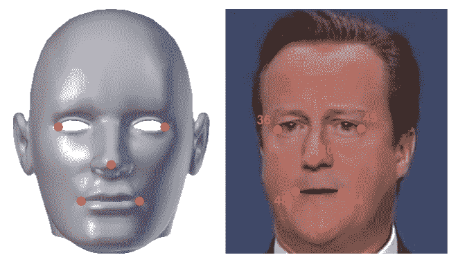 获得人脸地标后,我们可以尝试找出人脸的方向。 二维面地标点基本上符合头部的形状。 因此,给定一个通用人头的 3D 模型,我们可以找到多个人脸地标的大致对应的 3D 点,如下图所示: