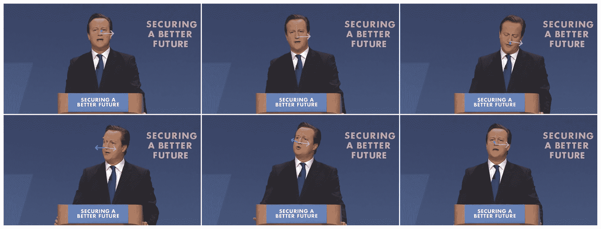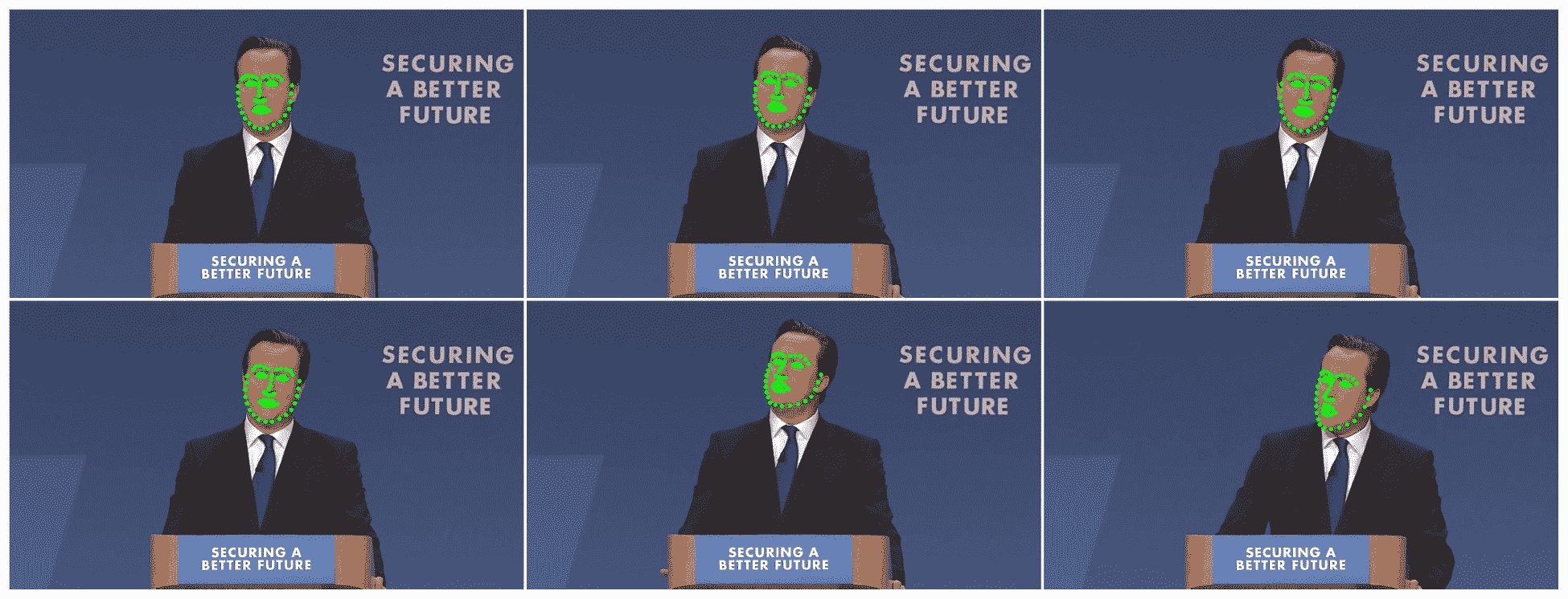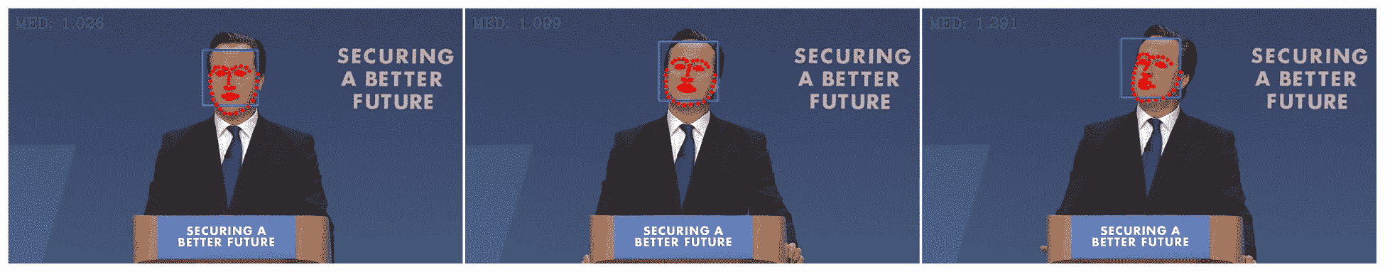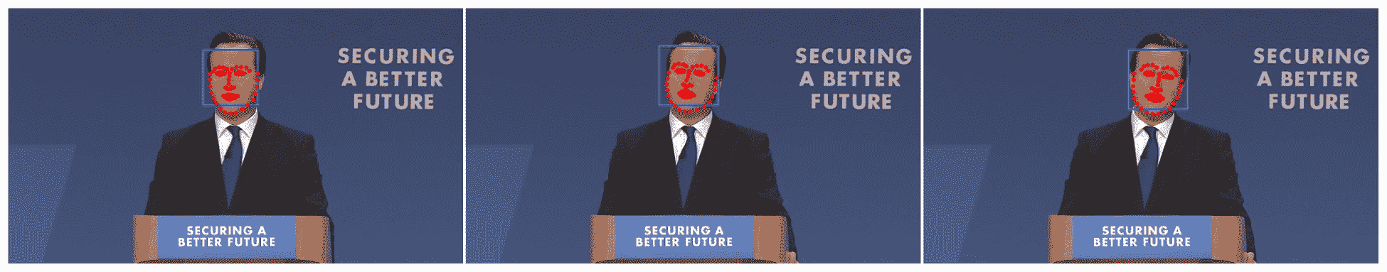 人脸标记检测器可以处理任何图像;但是,我们可以使用指定的人脸照片和视频数据集,这些数据集用于对人脸标记算法进行基准测试。 这样的数据集是300-VW,可通过智能行为理解小组(iBUG)获得,该小组是伦敦帝国理工学院的一个计算机视觉小组:https://ibug.doc.ic.ac.uk/resources/300-VW/。 它包含数百个人脸在媒体上露面的视频,仔细注释了 68 个人脸标志点。 该数据集可用于训练人脸标记检测器,以及了解我们使用的预训练模型的性能水平。 以下是 300 辆大众视频中的一段带有基本事实注释的节选: