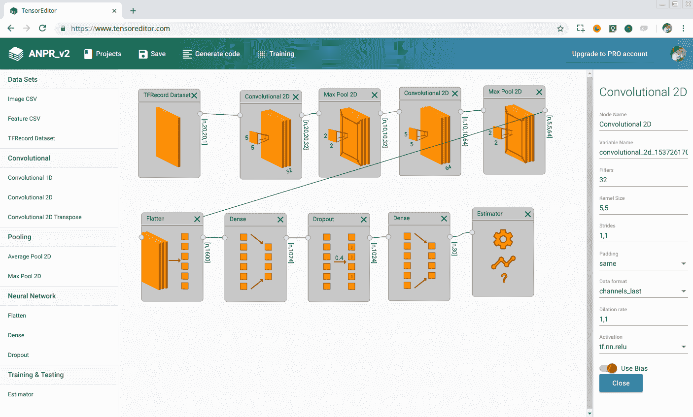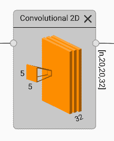 要添加一个层,我们通过单击左侧菜单来选择它,它将出现在编辑器中。 我们可以拖放来改变它的位置,双击来改变它的参数。 点击每个节点的小点,我们就可以链接到每个节点/层。 这个编辑器向我们展示了我们视觉上选择的参数和每个层的输出大小;我们可以在下图中看到,卷积层的核为 5 x 5 x 32,输出为 n x 20 x 20 x 32;n 变量表示我们可以为每个训练周期同时计算一幅或多幅图像: