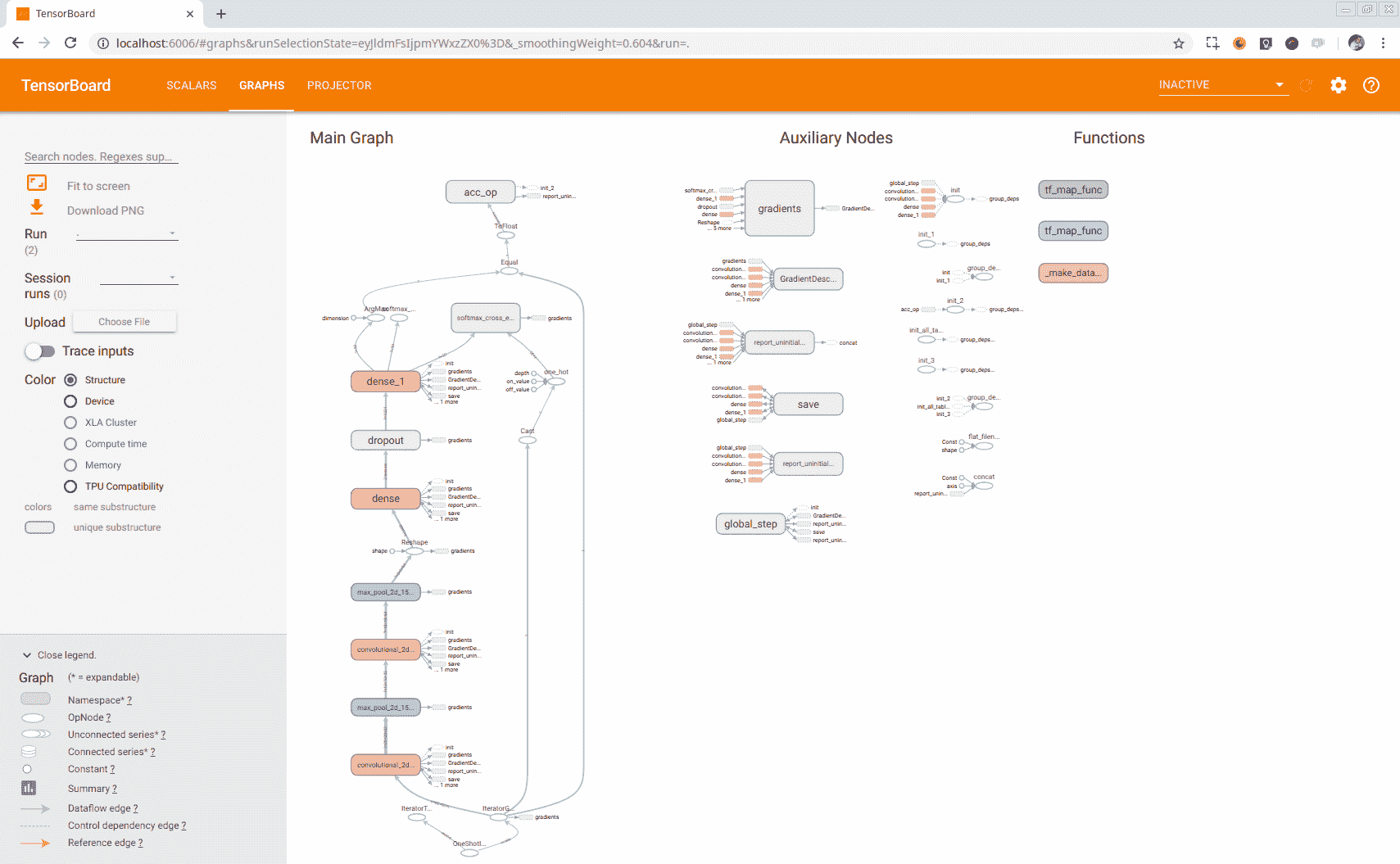 在这里,必须确定保存模型和检查点的参数--logdir。 启动 TensorBoard 后,我们可以通过以下 URL 访问它:http://localhost:6006。 这个很棒的工具向我们展示了 TensorFlow 生成的图形,我们可以在其中浏览每个操作和变量,单击每个节点,如我们在下一个屏幕截图中所示: