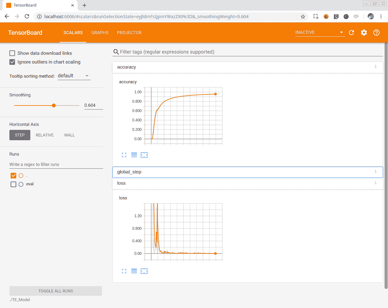 我们可以使用 TensorBoard,一个 TensorFlow 工具,它给我们提供了关于训练和图表的信息。 要激活 TensorBoard,我们必须使用以下命令: