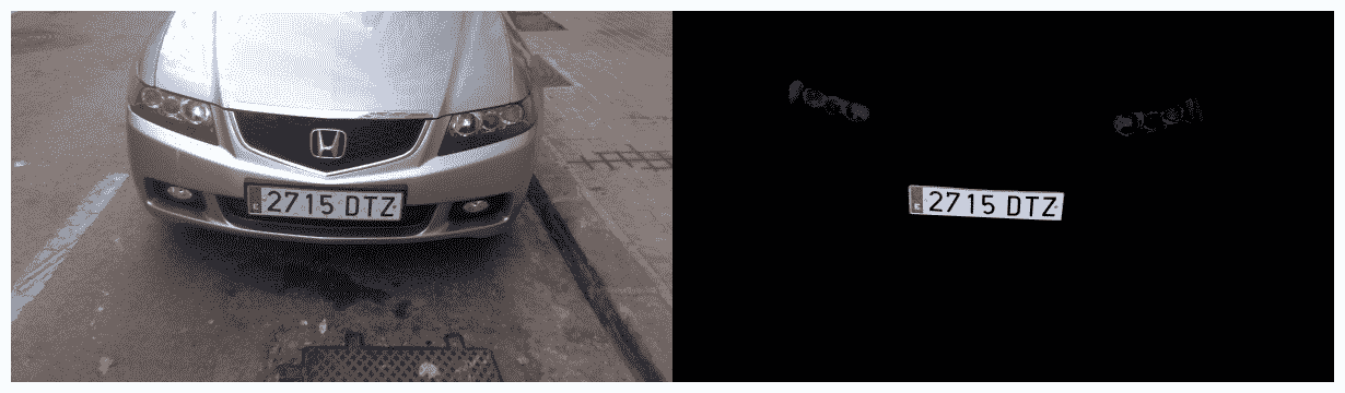 如果我们使用带有滤光片耦合的结构化红外线投影仪的摄像头,我们可以只检索红外光,然后我们就有了非常高质量的图像进行分割,随后我们可以独立于任何照明环境来检测和识别车牌号,如下图所示: