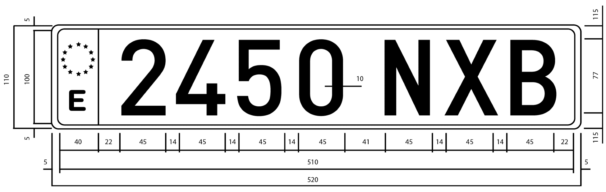 在本章中,我们将使用来自西班牙的车牌。 在西班牙,车牌有三种不同的大小和形状,但我们将只使用最常见的(大)车牌,它的宽度为 520 毫米,高度为 110 毫米。 两组字符以 41 mm 的间距分隔,每个单独的字符以 14 mm 的间距分隔。 第一组字符是四位数字,第二组是三个字母,不包括元音A、E、I、O或U,或者字母N或Q。 所有字符的尺寸均为 45 mm×77 mm。