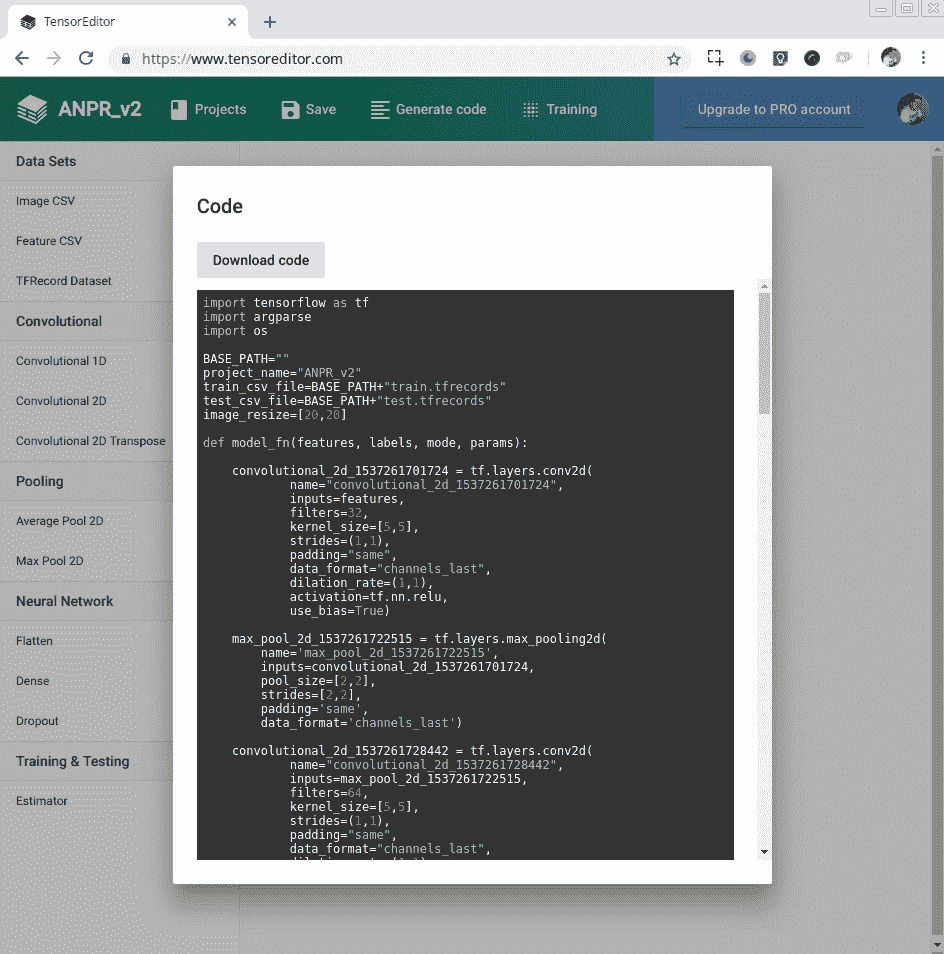 在 TensorEditor 中创建 CNN 层结构后,我们现在可以通过单击 Generate Code 并下载 Python 代码来下载 TensorFlow 代码,如以下屏幕截图所示: