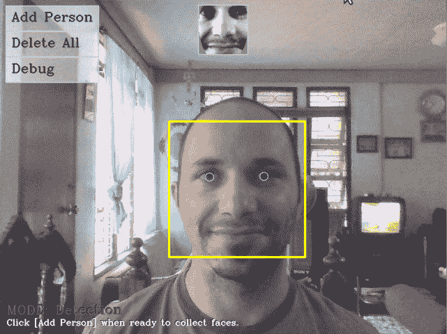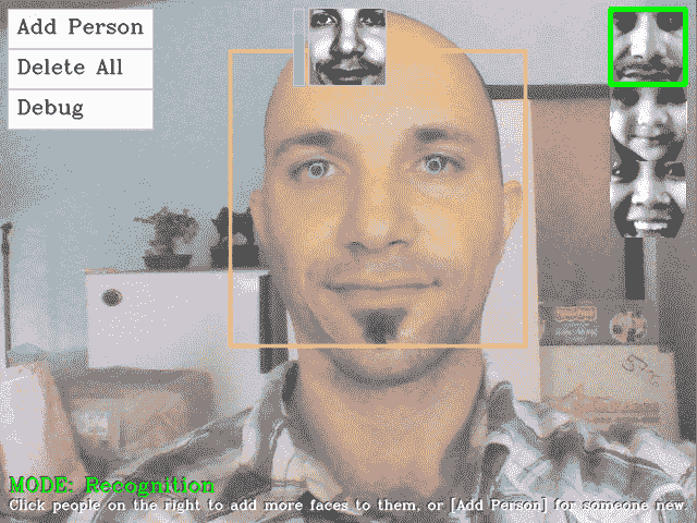 在识别模式下,预处理后的人脸旁边会显示一个置信度,这样用户就可以知道识别的可靠性有多高。 如果置信度高于未知阈值,则会在识别的人周围画一个绿色矩形,以方便显示结果。 如果用户点击添加人员按钮或现有人员之一,可以添加更多面孔进行进一步培训,这会导致程序返回到集合模式。