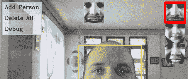 - 人脸识别:这是检查采集到的哪些人与摄像头中的人脸最相似的最新流程(下面截图右上角的一个小矩形)。