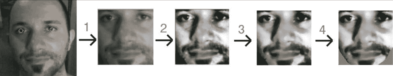 脸部预处理旨在通过确保脸部始终看起来具有相似的亮度和对比度,或许还能确保脸部特征始终处于同一位置(例如将眼睛和/或鼻子与某些位置对齐)来减少这些问题。 一个好的人脸预处理阶段将有助于提高整个人脸识别系统的可靠性,因此本章将重点介绍人脸预处理方法。