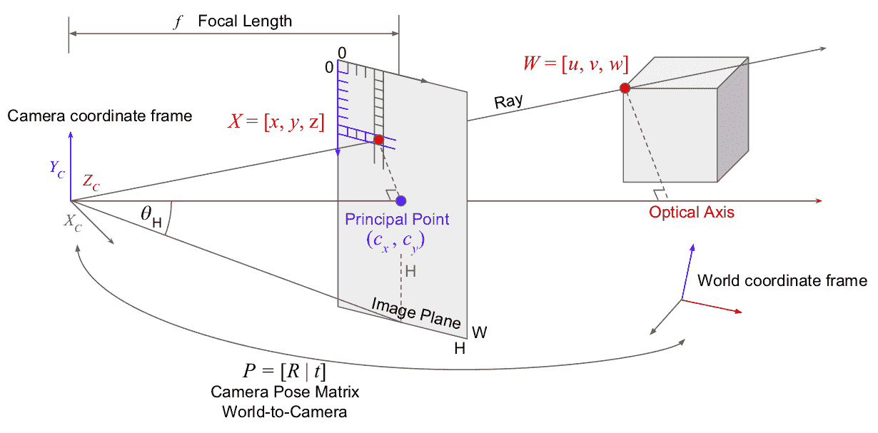 在我们手头的视觉任务中,恢复场景中的几何图形,我们将使用针孔相机模型,它大大简化了我们先进的数码相机获取图像的方式。 针孔模型本质上描述了世界对象到相机图像中的像素的变换。 下图说明了此过程: