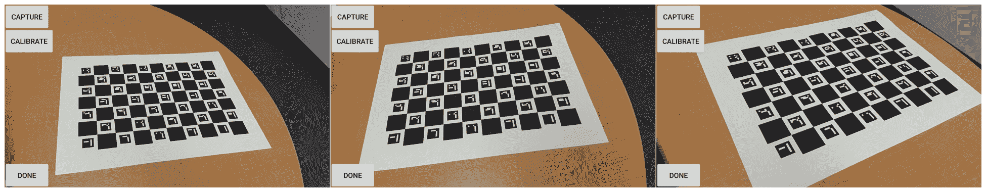我们需要通过移动相机或电路板来获得电路板的多个视图。 将纸板粘贴在一块硬纸板或塑料上可以方便地在移动纸板时保持纸张平整,或者在移动相机时将纸板平放在桌子上。 我们可以实现一个非常简单的 Android UI 来捕获图像,只需三个按钮:捕获、校准和完成: