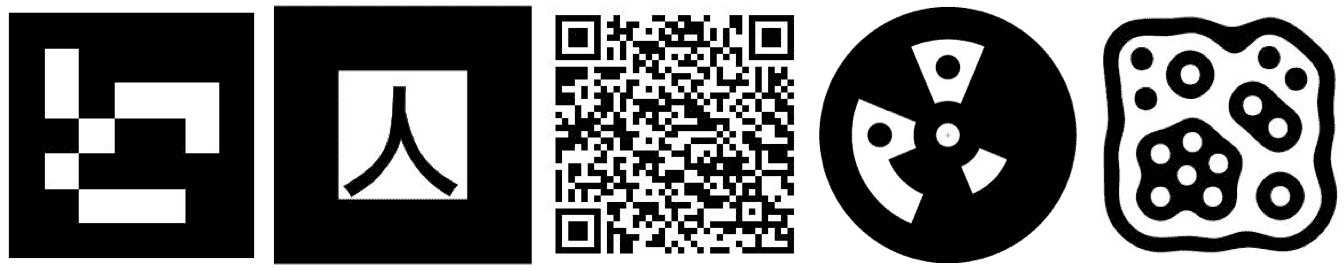 在过去,AR 主要基于使用基准标记,对比清晰(主要是黑白),通常是矩形印刷标记(请参阅下一节中此类标记的示例)。 使用它们的原因是很容易在图像中找到它们,因为它们的对比度很高,而且它们有四个(或更多)清晰的角,我们可以根据这些角来计算标记相对于相机的平面。 这是自 90 年代第一次 AR 应用以来的做法,至今在许多 AR 技术原型中仍是一种高度使用的方法。 本章将使用这种类型的 AR 检测,但是,如今 AR 技术已经转向其他 3D 几何重建方法,例如自然标记(非矩形,大多是非结构化的)、运动结构(SFM)和映射和跟踪(也称为同时定位和映射)(SLAM)。