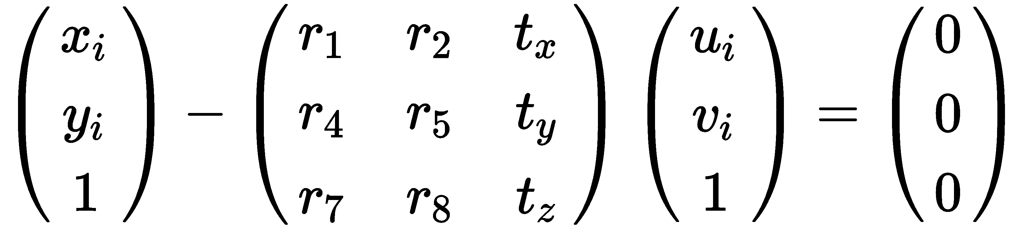 。 剩下的 3x3 矩阵是单应;它在一个平面(图像平面)和另一个平面(标记平面)之间转换。 我们可以通过构造齐次线性方程组来估计矩阵的值,如下所示: