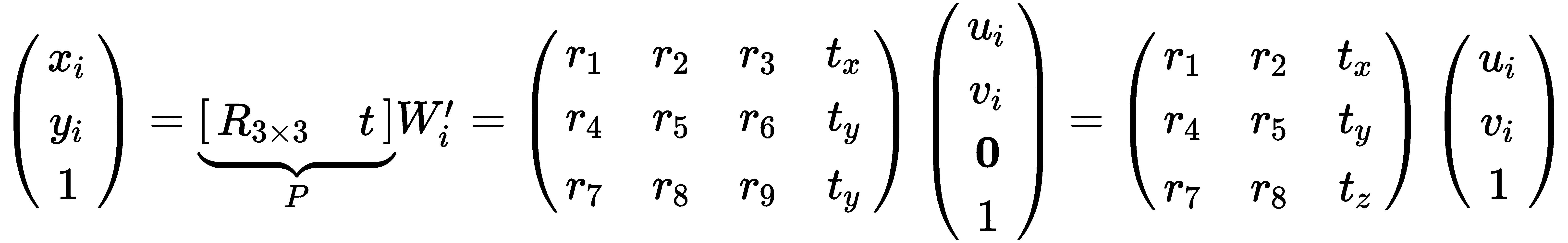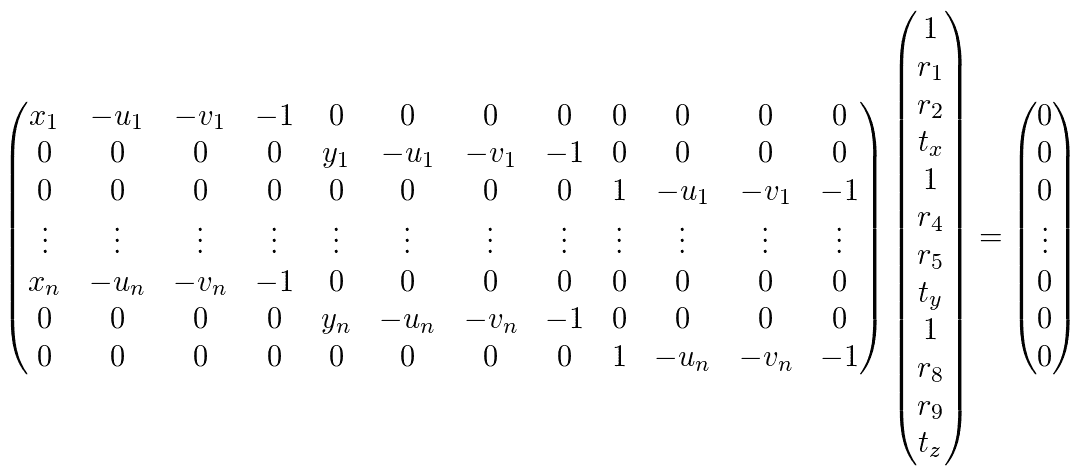 给定标记上的 2D 点及其成对的 3D 坐标(以毫米为单位),我们可以使用上一节中介绍的原理为每一对编写以下公式: