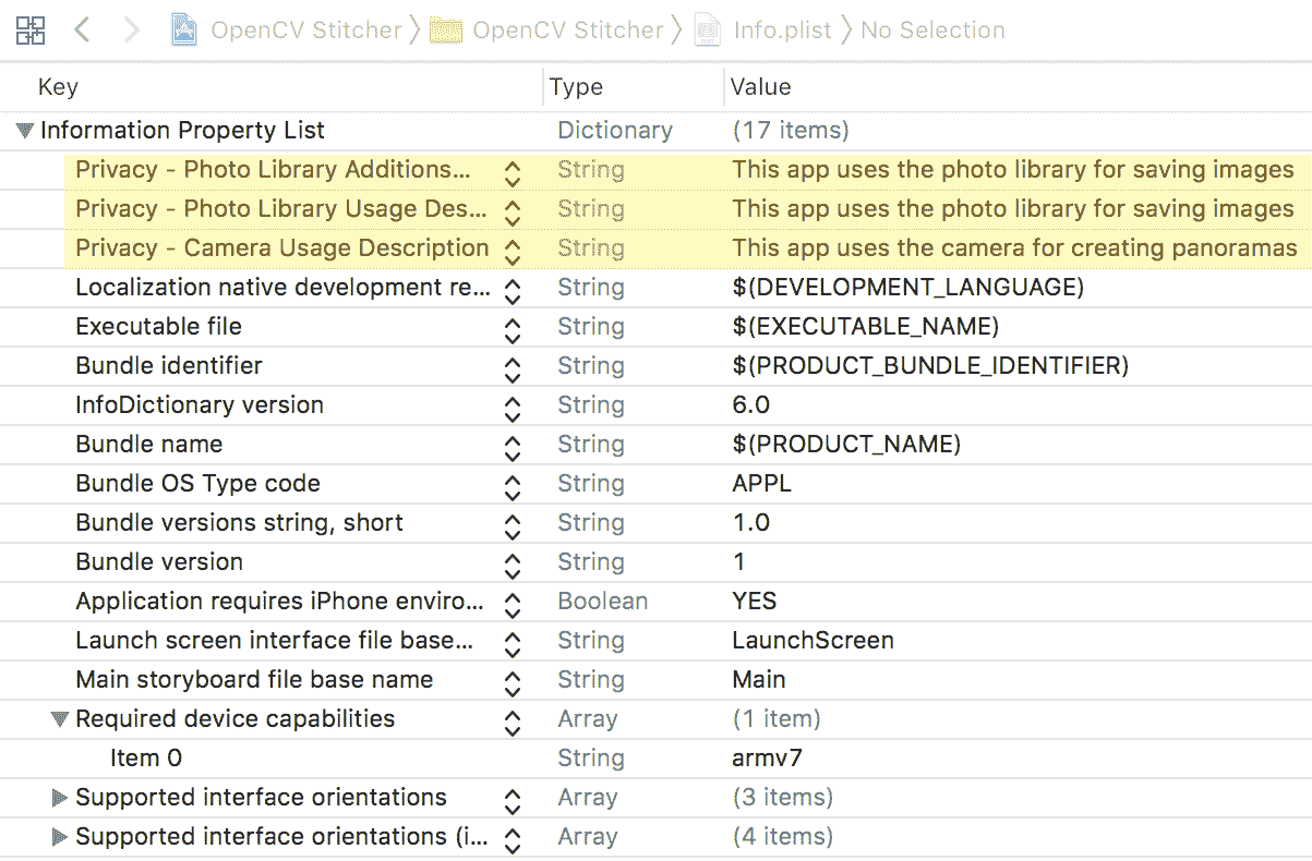 在深入研究将图像集合转换为全景图的 OpenCV 代码之前,我们将首先构建一个 UI 来支持轻松捕获一系列重叠图像。 首先,我们必须确保我们可以访问摄像机以及保存的图像。 打开Info.plist文件并添加以下三行: