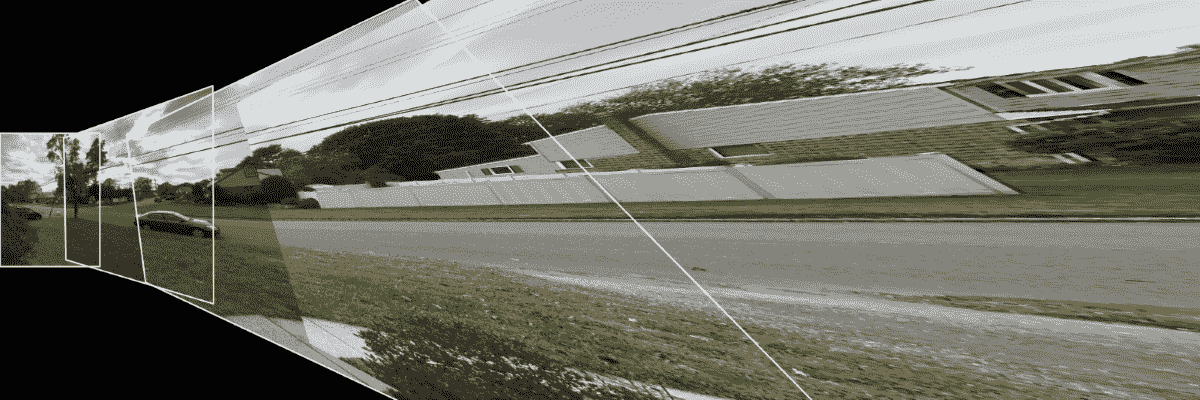如果我们知道图像之间的单应关系,我们就可以应用它们的逆来将所有图像投影到同一平面上。 但是,例如,如果所有图像都投影到第一个图像的平面上,则使用单应性的直接扭曲最终会产生拉伸的外观。 在下图中,我们可以看到使用拼接的单应(透视)扭曲的 4 个图像的拼接,这意味着所有图像都对准到第一个图像的平面,这说明了笨拙的拉伸: