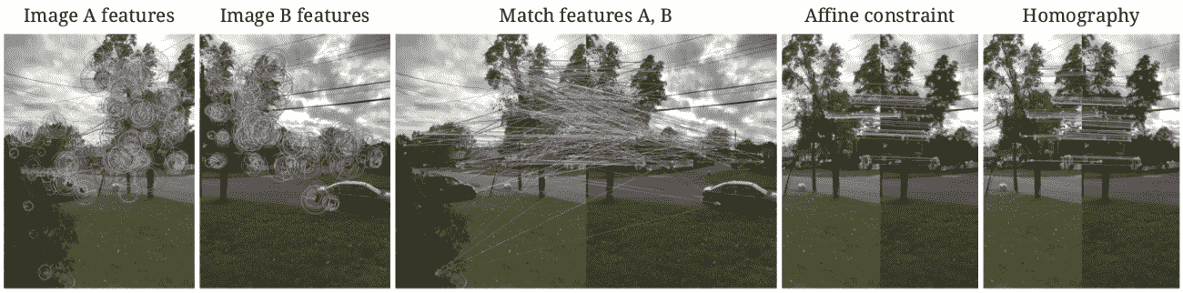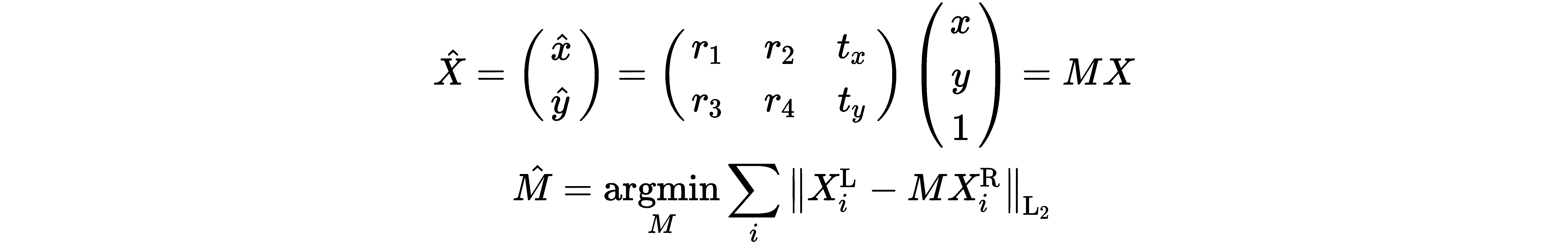 对于健壮且有意义的两两匹配,我们通常会应用几何约束。 一个这样的约束可以是仿射变换,这是一种只允许缩放、旋转和平移的变换。 在 2D 中,仿射变换可以在 2 x 3 矩阵中建模: