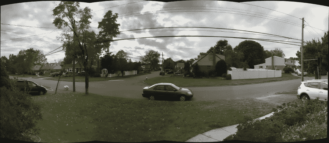 使用此代码创建的输出全景示例(请注意柱面扭曲的使用)如下所示: