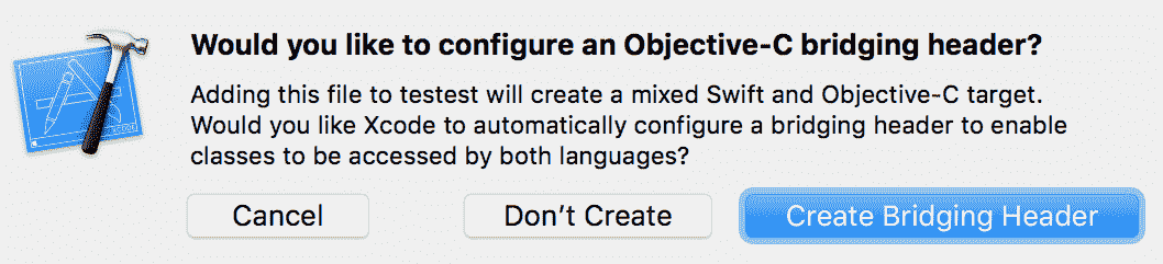 接下来,如以下屏幕截图所示,确认 Xcode 应该为您的 Objective-C 代码创建桥头代码:
