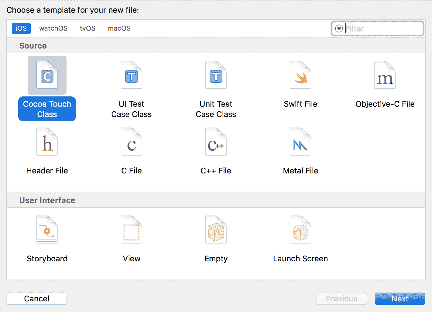 首先,我们在 Xcode 中创建一个新文件(Command-N),并选择 Cocoa Touch Class,如以下屏幕截图所示: