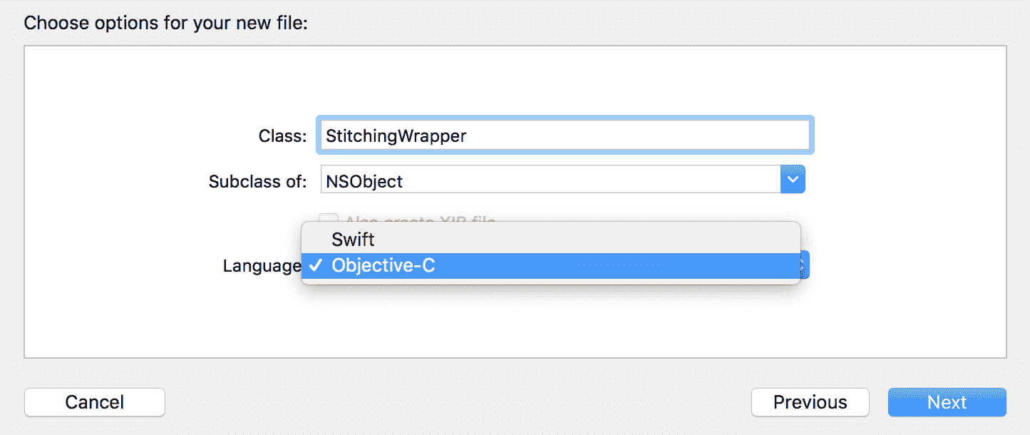 为文件选择一个有意义的名称(例如,StitchingWrapper),并确保选择 Objective-C 作为语言,如以下屏幕截图所示: