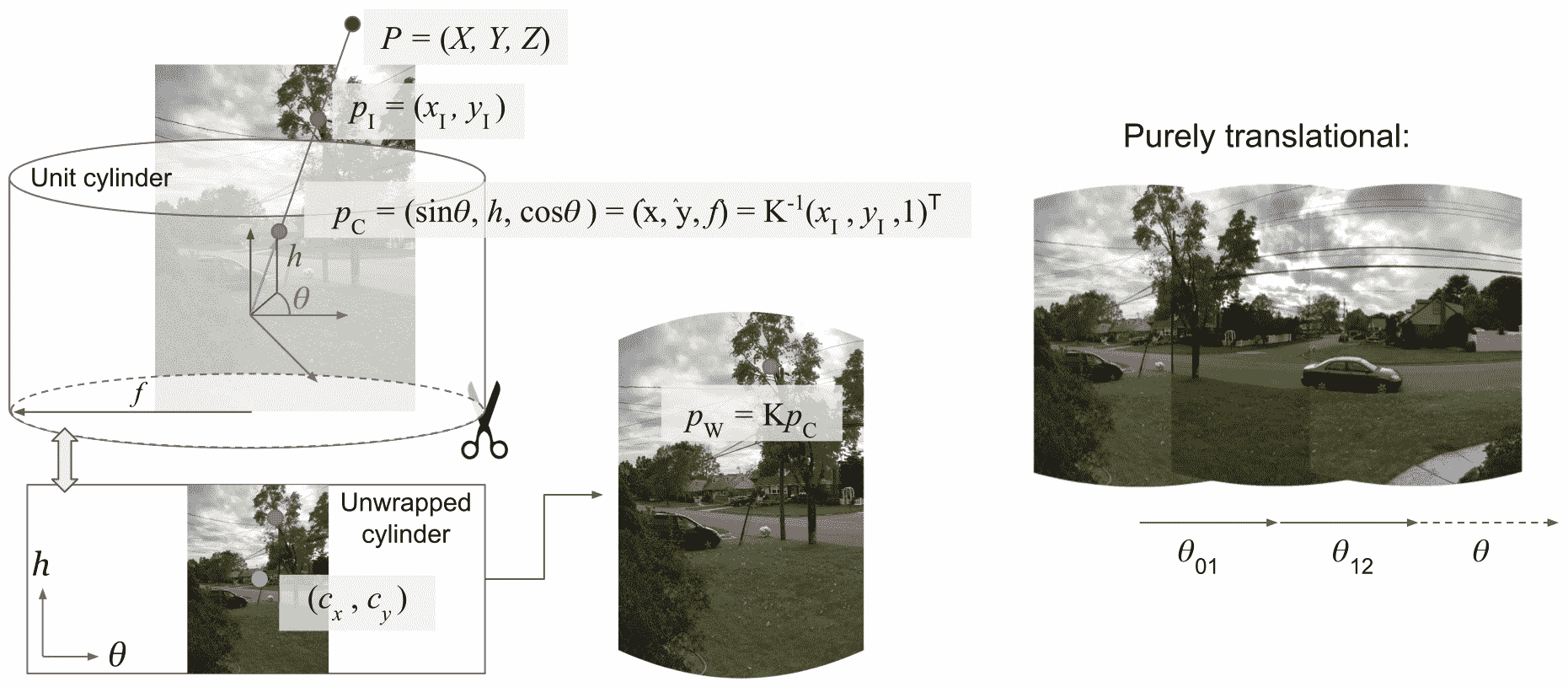 为了在柱面坐标中包装图像,我们首先应用本征矩阵的逆来获得归一化坐标中的像素。 我们现在假设像素是圆柱体表面上的一个点,该点由高度h和角度θ参数化。 高度h实质上对应于y坐标,而xz(相对于y彼此垂直)存在于单位圆上,因此分别对应于 Sinθ和 Cosθ,Sin。 要获得与原始图像相同像素大小的扭曲图像,我们可以再次应用固有矩阵K;但是,我们可以更改焦距参数f,以影响全景图的输出分辨率。