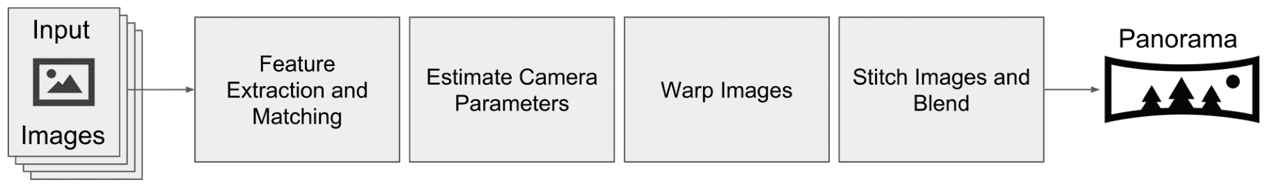 全景图本质上是将多幅图像融合成一幅图像。 从多个图像创建全景图的过程涉及许多步骤;其中一些是其他计算机视觉任务所共有的,如下所示: