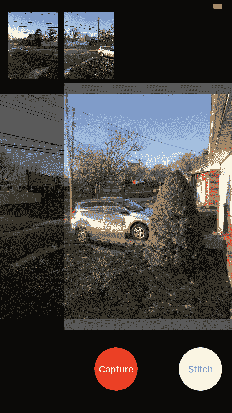 这将允许我们连续捕捉多幅图像,同时帮助用户将一幅图像与另一幅图像对齐。 以下是在手机上运行的 UI 示例:
