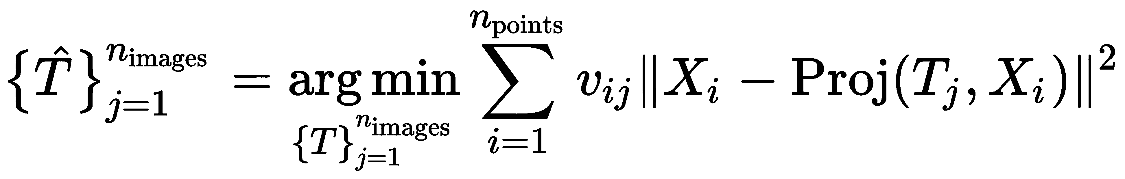 其中我们寻找最佳摄像机或图像变换T,使得原始点XI和重新投影点Proj(Tj,Xi)之间的距离最小。 二进制变量vij标记点i是否可以在图像j中看到,并可能导致错误。 这类优化问题可以用迭代非线性最小二乘法求解,如Levenberg-MarQuardt,因为以前的Proj函数通常是非线性的。