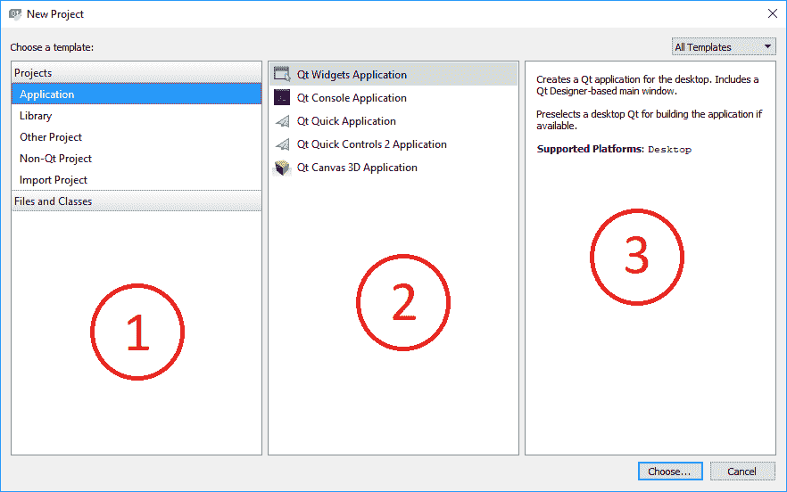 如果单击“新建项目”按钮,将显示“新建项目”窗口,该窗口允许您根据要开发的内容选择项目类型(或模板)。 稍后您将看到,我们将仅使用Applications/Qt Widgets Application和Library/C++ Library选项,因为遍历所有可能的 Qt 项目模板不在本书的范围之内。 但是,如下面的屏幕快照所示,“新建项目”窗口包含三个部分,您只需选择它们,就可以对每种项目类型获得非常有用的描述。 使用第一个列表和第二个列表单击任何项目类型后(在下面的屏幕截图中),它们的描述将出现在第三个窗格中。 这是选择Qt Widgets Application项目类型时出现的描述(请参见下图,尤其是 3 号窗格):