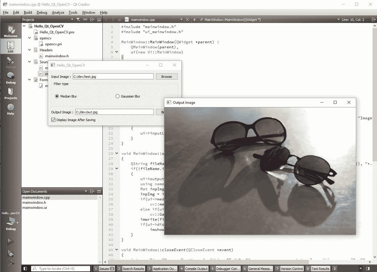 现在,让我们回顾一下我们刚刚编写的代码,看看它的真正作用。 如您所见,这一次,我们在QFileDialog类和标题中使用了getSaveFileName函数,并且过滤器也有所不同。 这是必需的,以便用户在要保存输出图像时分别选择每种图像类型,而不是在打开它们时看到所有图像。 这次,我们也没有检查文件的存在,因为这将由QFileDialog自动完成,因此仅检查用户是否确实选择了某项就足够了。 在以下几行中,我们编写了一些特定于 OpenCV 的代码,在接下来的章节中,我们将越来越多地了解这些功能。 在第 1 章,“OpenCV 和 Qt 简介”中,您还以很小的剂量使用了它,因此,它们到现在为止还不完全陌生。 但是,我们将再次简短地讨论它们,并继续介绍 IDE 和Hello_Qt_OpenCV应用。
