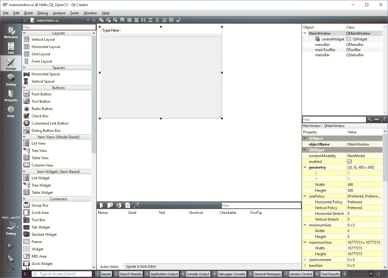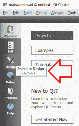 这是您进行所有用户界面设计的方式。 您可以使用 Qt Creator 屏幕左侧的“设计”按钮切换到“设计”模式。 请注意,如果此按钮显示为灰色(表示该按钮处于非活动状态),则需要首先选择一个用户界面文件(*.ui),因为使用设计器只能打开ui文件。 为此,您可以双击左窗格(“项目”窗格)中的mainwindow.ui文件: