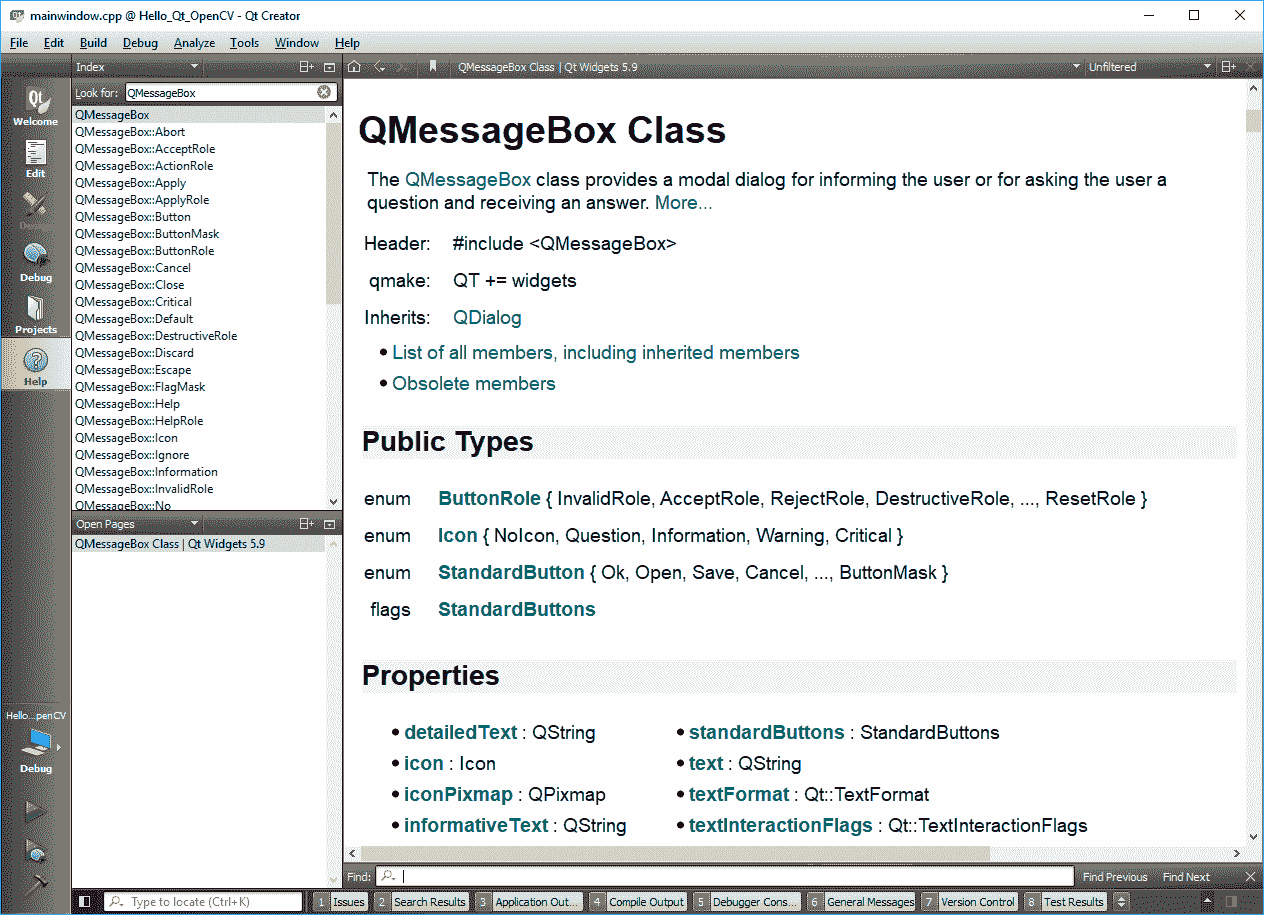 如您所见,可以使用索引并搜索QMessageBox类的文档页面。 注意描述之后的前两行: