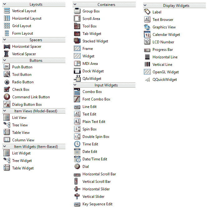 在设计模式下,您可以在用户界面上查看可使用的 Qt 小部件列表。 从这些图标和名称可以立即识别出大多数这些小部件的用途,但是仍然有一些特定于 Qt 的小部件。 这是默认情况下 Qt Creator 中代表所有可用布局和小部件的屏幕截图:
