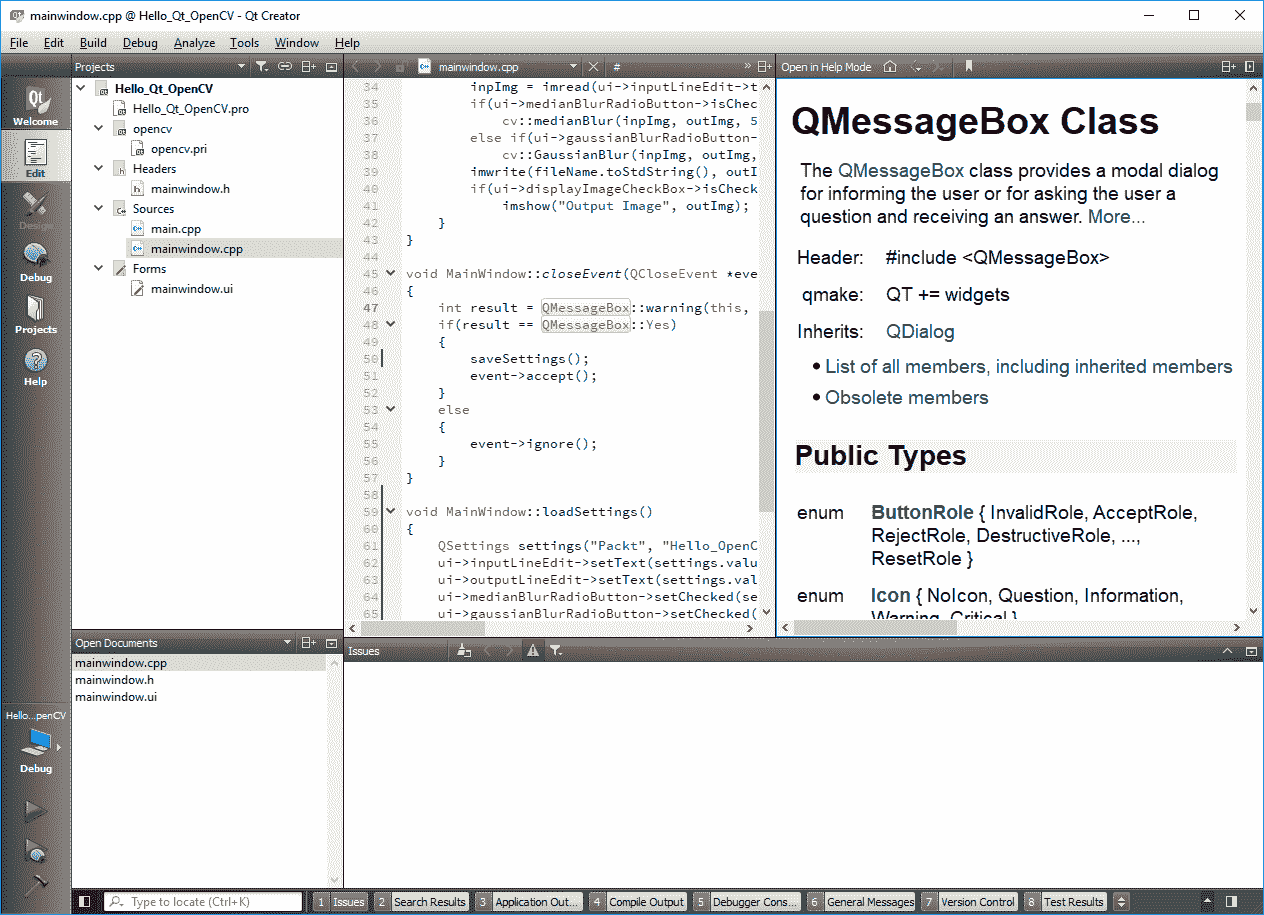 这基本上意味着,为了在项目中使用QMessageBox,必须在源文件中包含QMessageBox标头,并将小部件模块添加到PRO文件中。 尝试搜索本章中使用的所有类,然后在文档中查看其示例。 Qt Creator 还提供了非常强大的上下文相关帮助。 您只需在任何 Qt 类上用鼠标单击F1,它的文档页面都将在编辑模式下的代码编辑器中获取: