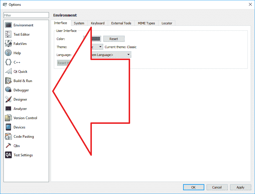 除此之外,您始终可以使用 Qt Creator 的过滤器工具立即在“选项”窗口中找到所需的设置: