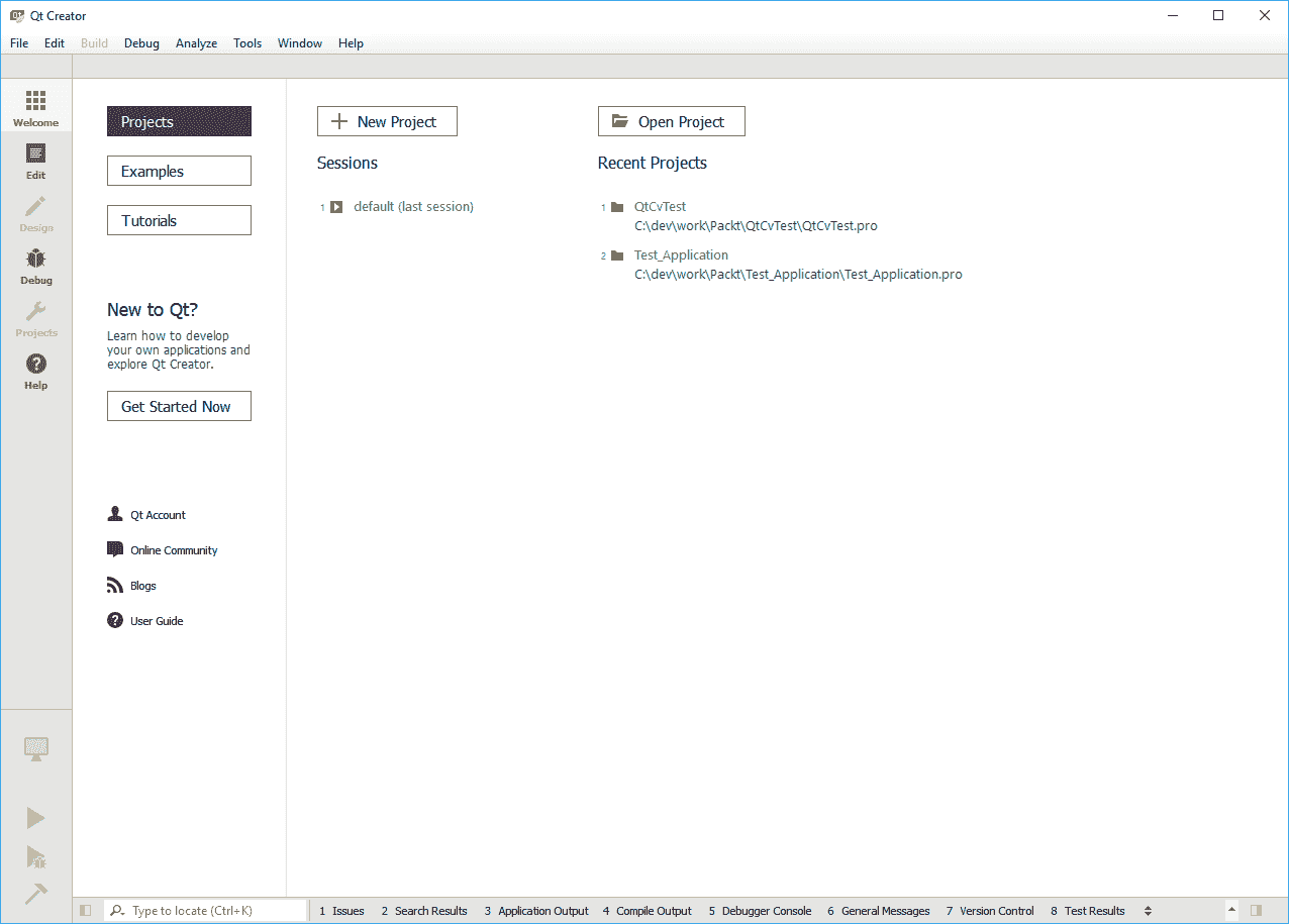此屏幕(或“欢迎”模式的子模式)可用于使用“新建项目”按钮创建新的 Qt 项目。 在第 1 章,“OpenCV 和 Qt 简介”中,您已经非常简短地体验了它的完成方式。 如果单击“打开项目”按钮,也可以打开计算机上保存的所有项目。 还有一个包含“最近的项目”的列表,该列表非常有用,既可以提醒您正在处理的内容,又可以作为访问它们的快捷方式。 在此模式下也有可见的会话,这是 Qt Creator 的一些最有趣的功能。 会话用于存储 IDE 的状态,并在以后需要时恢复该状态。 在本书中,我们不会理会会话,但是如果正确使用它们,它们将非常方便,并且可以在开发过程中节省大量时间。