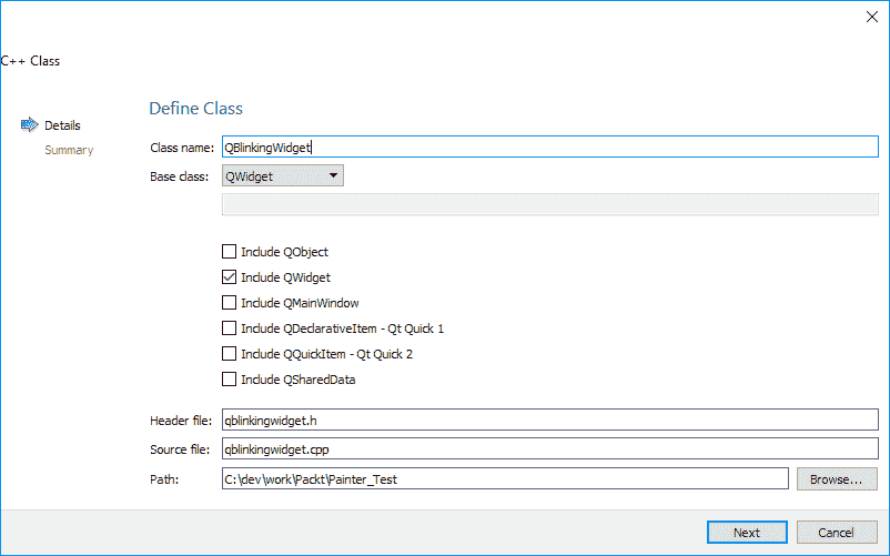QBlinkingWidget,并将“基类”选择为QWidget。 确保选中“包括QWidget”复选框,并保留其余选项,如以下屏幕截图所示: