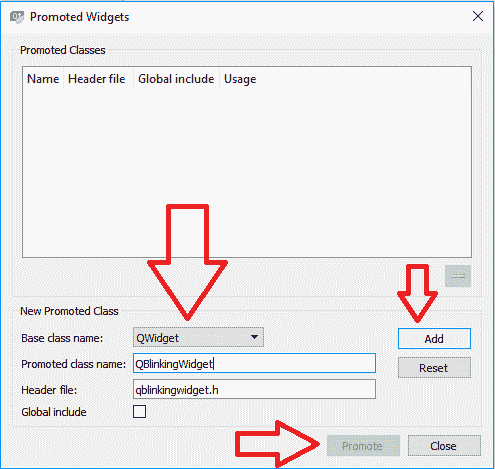 Promoted Widgets窗口,将Promoted类名设置为QBlinkingWidget,然后按Add按钮: