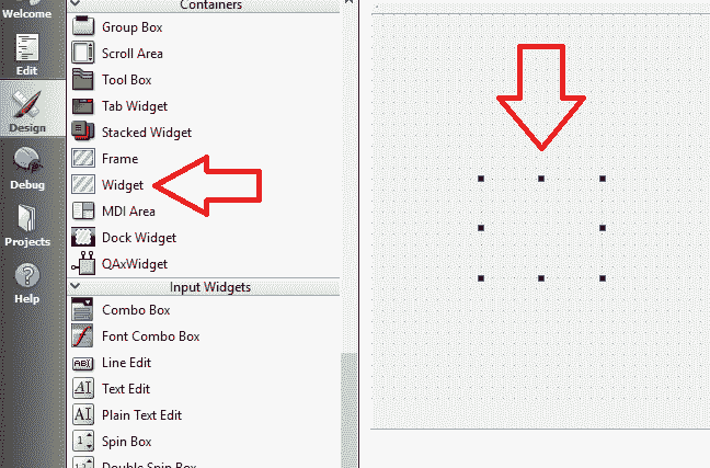 mainwindow.ui切换到设计模式,然后将小部件添加到MainWindow类。Widget的确切含义是Widget,它是一个空的,当您将其添加到MainWindow时会注意到。 请参见以下屏幕截图: