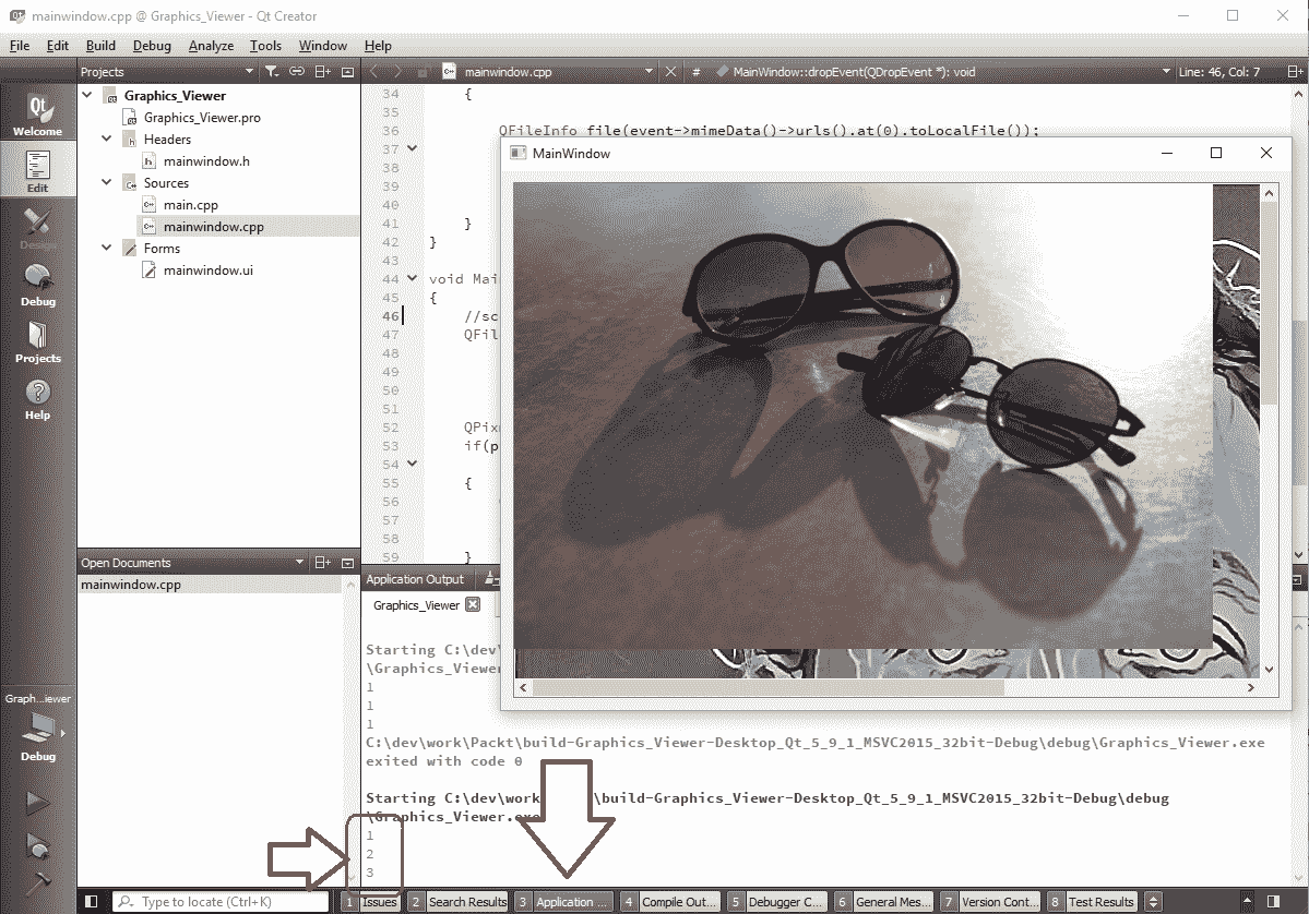 现在,如果您运行该应用并尝试通过将其拖放到窗口中来添加图像,您会注意到,在 Qt Creator 代码编辑器屏幕底部的“应用输出”窗格中,每次放置图像时,所显示的数字增加,即scene中items的count: