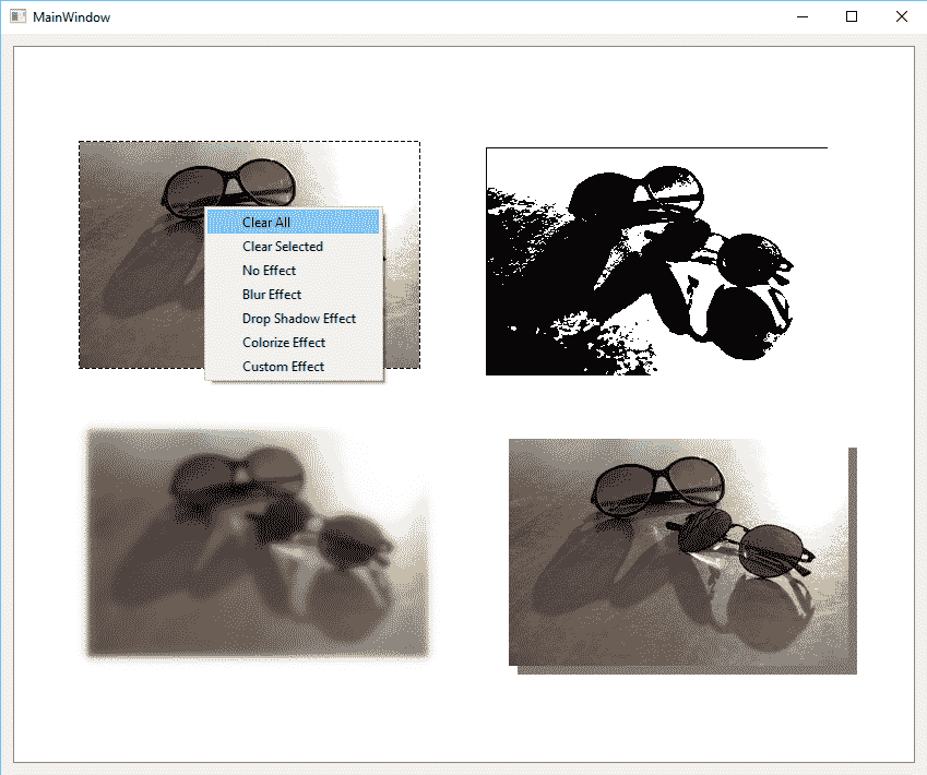 在前面的代码中,//***对于dropShadowEffect,colorizeEffect和customEffect函数插槽基本上以相同的模式重复。 在前面的代码中,我们所做的只是简单地创建并打开一个上下文(右键单击)菜单,然后将每个动作连接到将在下一步中添加的插槽。