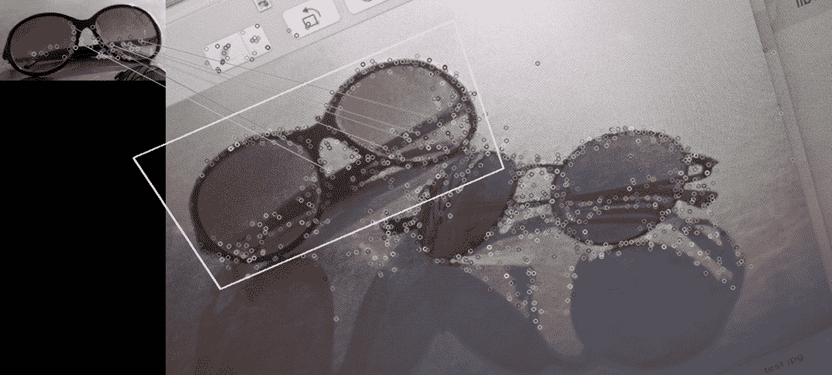 我们还可以将drawMatches结果与检测结果结合起来,这意味着,我们可以在匹配结果图像上方绘制检测边界框,这可能会更有帮助,尤其是在微调参数或出于其他任何信息目的时 。 为此,您需要确保首先调用drawMatches函数以创建输出图像(在我们的示例中为dispImg变量),然后添加所有具有偏移值的点,因为drawMatches也将第一个图片在左侧输出。 此偏移量仅有助于将我们生成的边界框移到右侧,或者换句话说,将第一张图像的宽度添加到每个点的X成员。 这是完成的过程: