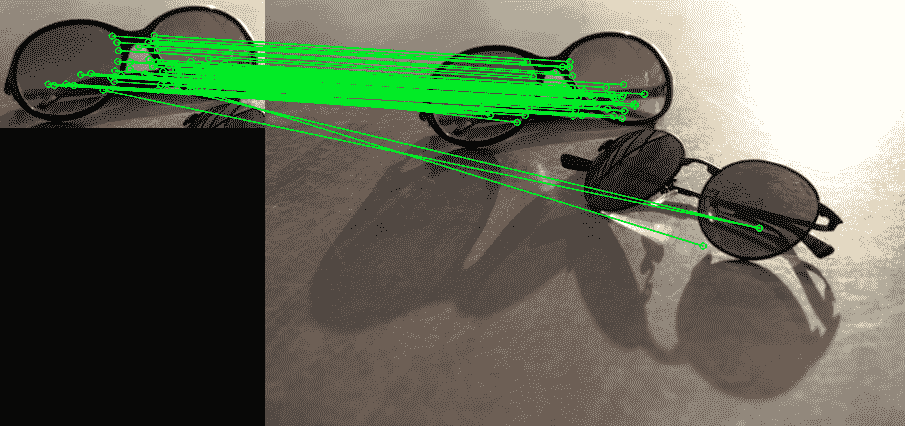 这是我们可以过滤掉不需要的匹配结果以获得良好匹配的方法。 请注意,匹配阈值的0.1值是通过反复试验得出的。 通常在匹配集中找到最小和最大距离,然后仅接受距离小于与最小距离相关的某个值的匹配,尽管这不是我们在此处所做的: